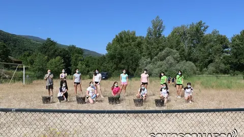Las jugadoras de voleibol de O Barco acondicionan la pista deportiva de O Salgueiral