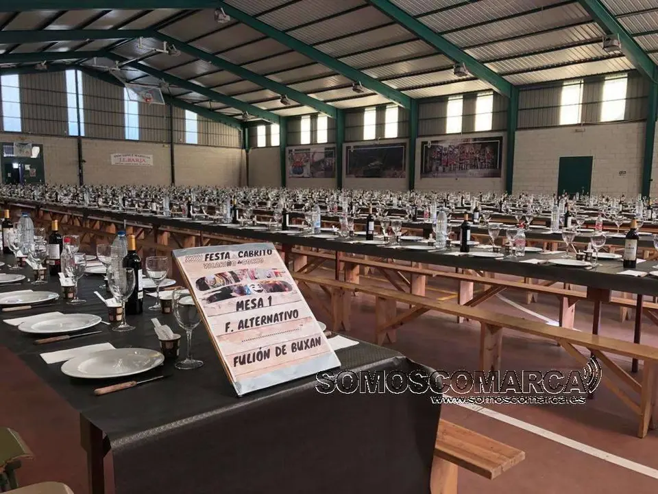 Os membros dos folións e acompañantes xantaron na carpa —uns 1.000— e o resto de comensais fíxoo na carpa habilitada para tal menester —820 asistentes—. O menú en ambos sitios estivo formado por chourizos cocidos, empanada e por suposto o preciado cabrito. De sobremesa bica e todo acompañado por viños da zona.